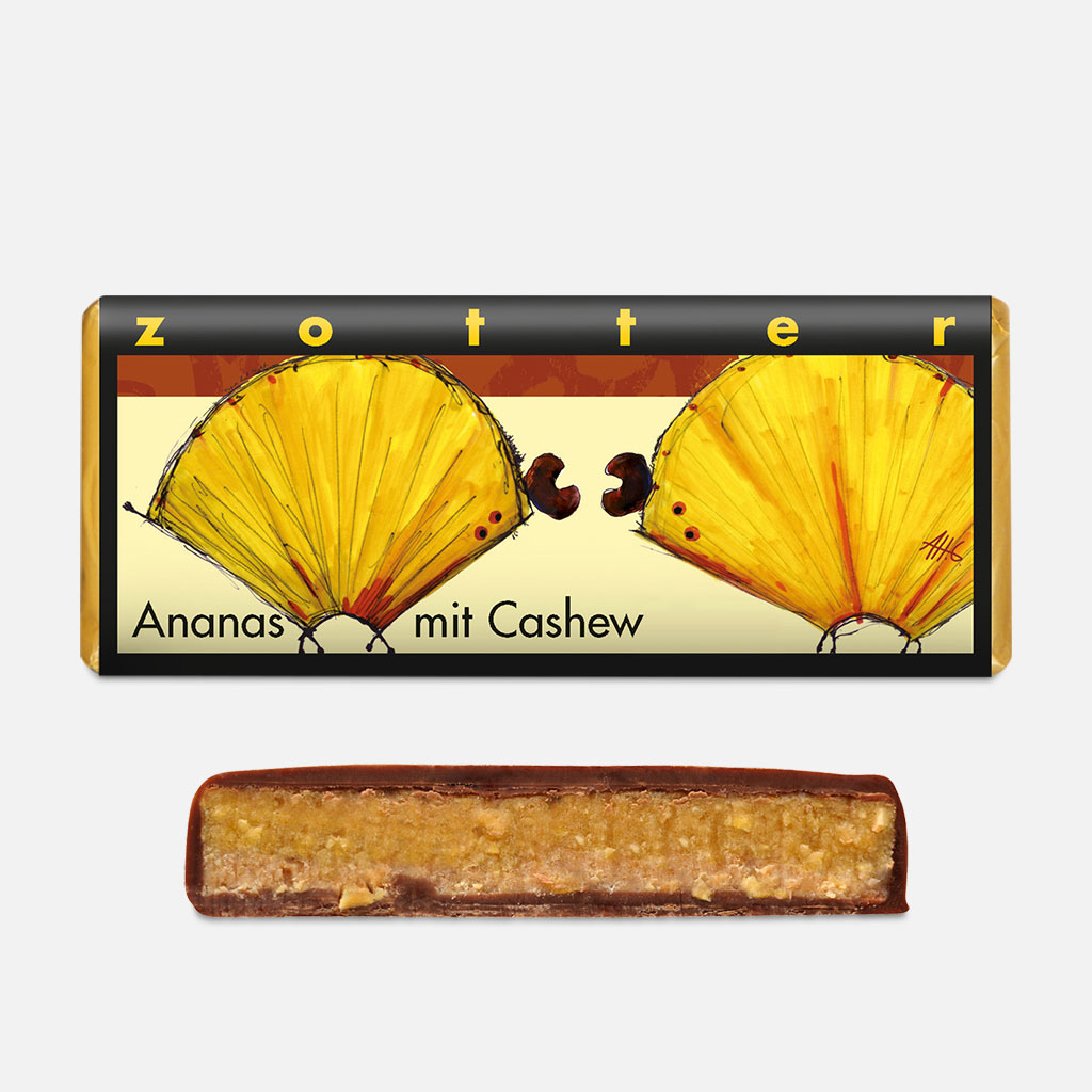 "Ananas mit Cashew" ist unser persönlicher Favorit: Eine dunkle Milchschokolade, gefüllt mit einer Ananas-Fruchtschicht und Cashewnougat. Die Nüsse werden schonend geröstet und zu einem zartschmelzenden Nougat verarbeitet, das mit kleinen Cashewstückchen vollendet wird. Die fruchtig-säuerliche Ananas mit ihrem unwiderstehlichen Aroma sorgt für eine regelrechte Geschmacksexplosion.