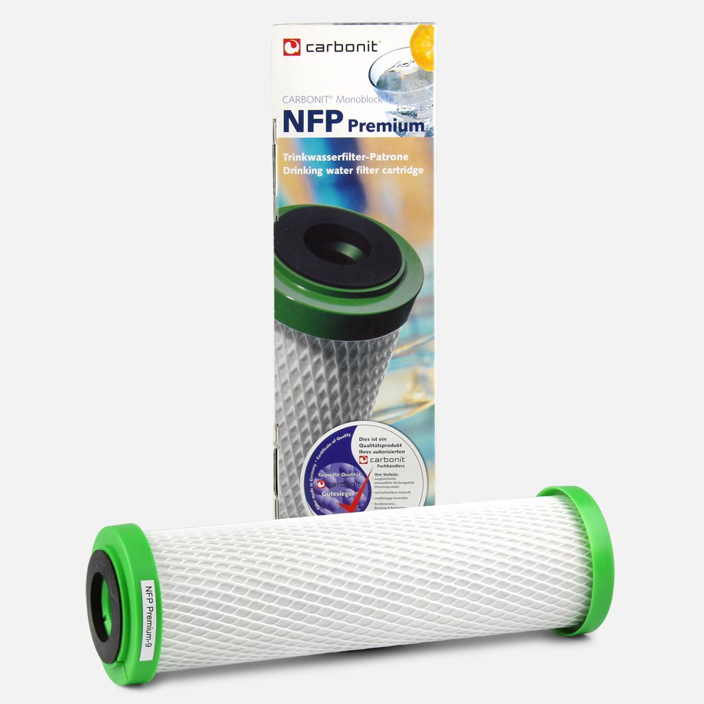 Genormter 9 3/4" Carbonit Monoblock NFP Premium-9 mit einer Filterfeinheit von 0,45 µm absolut. Flachdichtung (SOE) mit O-Ring. Hoher Schutz vor Bakterien, Schwermetallen, Pestiziden, polaren Pestiziden und Arzneimittelrückständen. Dieser Blockfilter verbindet die bekannten adsorptiven Kräfte der gesinterten Aktivkohle (z.B. Pestizide) mit mechanischer Filtration (z.B. Bakterien). Kapazitätsgesteurter Filterwechsel für "Leistung bis zum letzten Tropfen". Bei Verschmutzung verschließt sich der Filter selbst (stark verminderter Wasserdurchfluss).